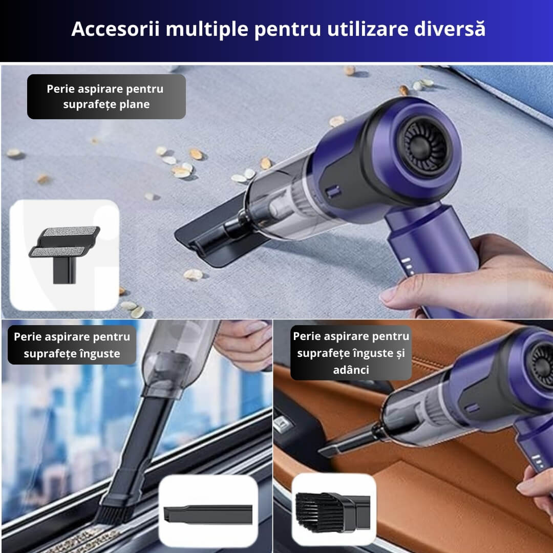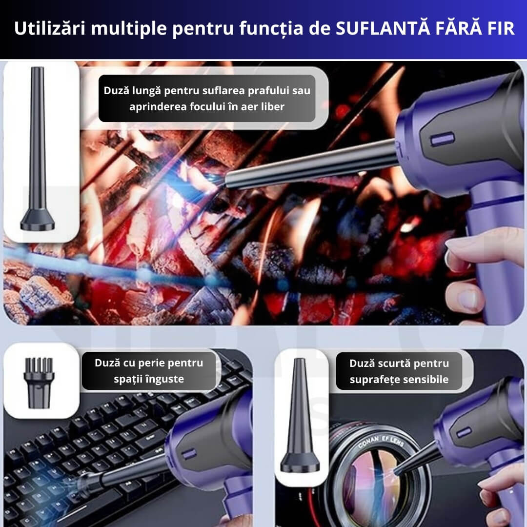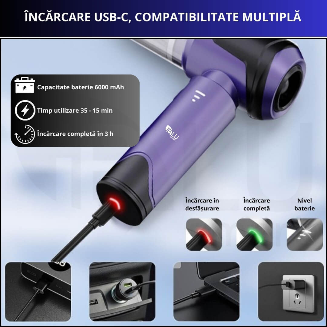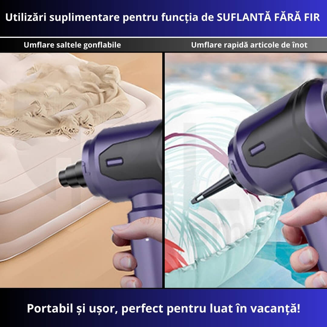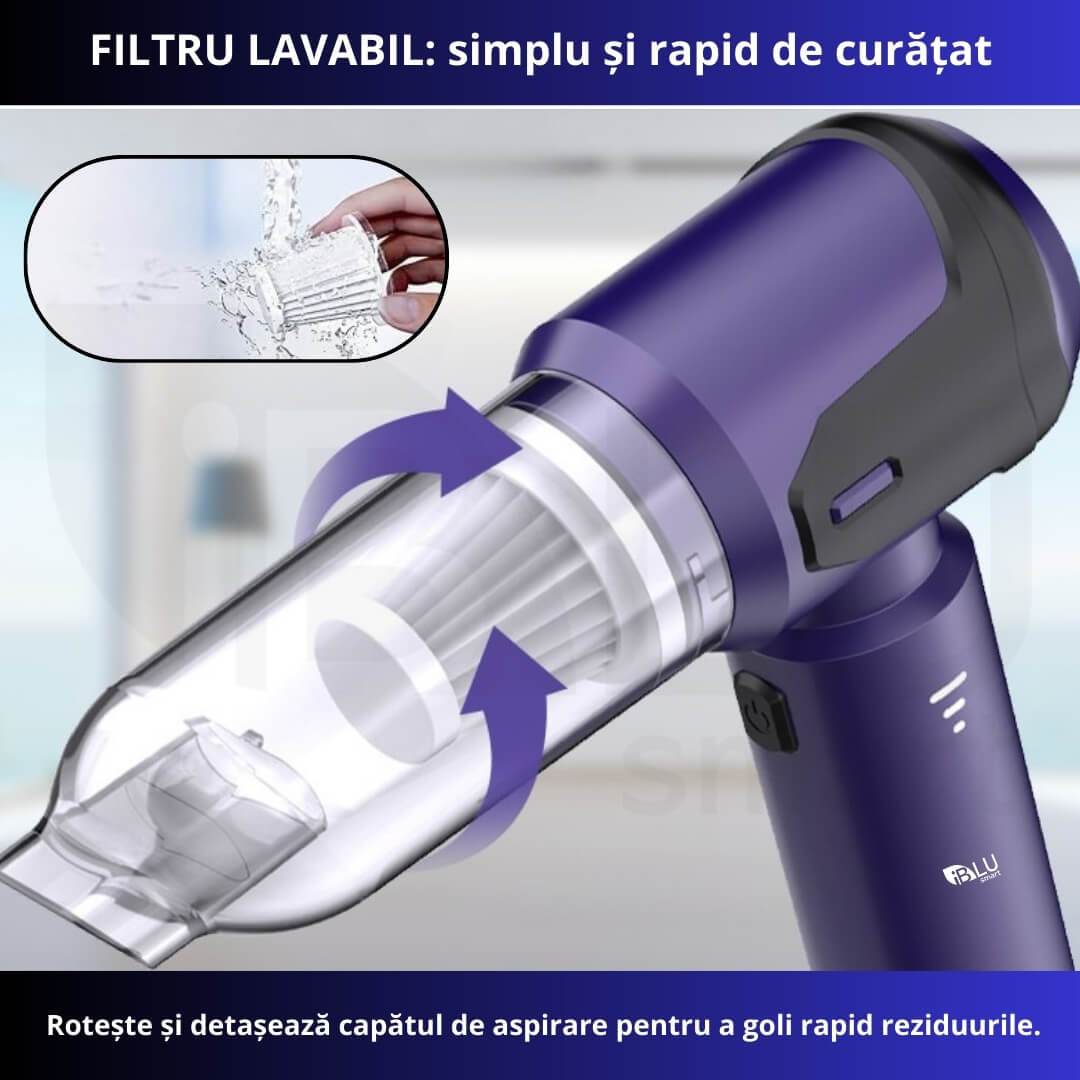 🔋 Wireless, portabil, baterie 6000 mAh + filtru lavabil pentru utilizare ușoară și durabilă.