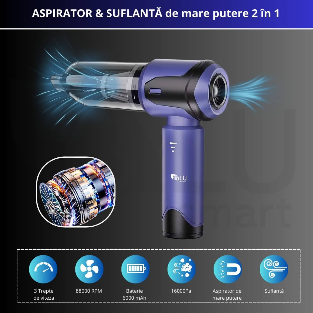 🌀 Curățenie completă, oriunde ai nevoie. Aspiratorul iBLU 2-în-1 aspiră, suflă și videază cu o putere de 16.000Pa și motor brushless de 110W.