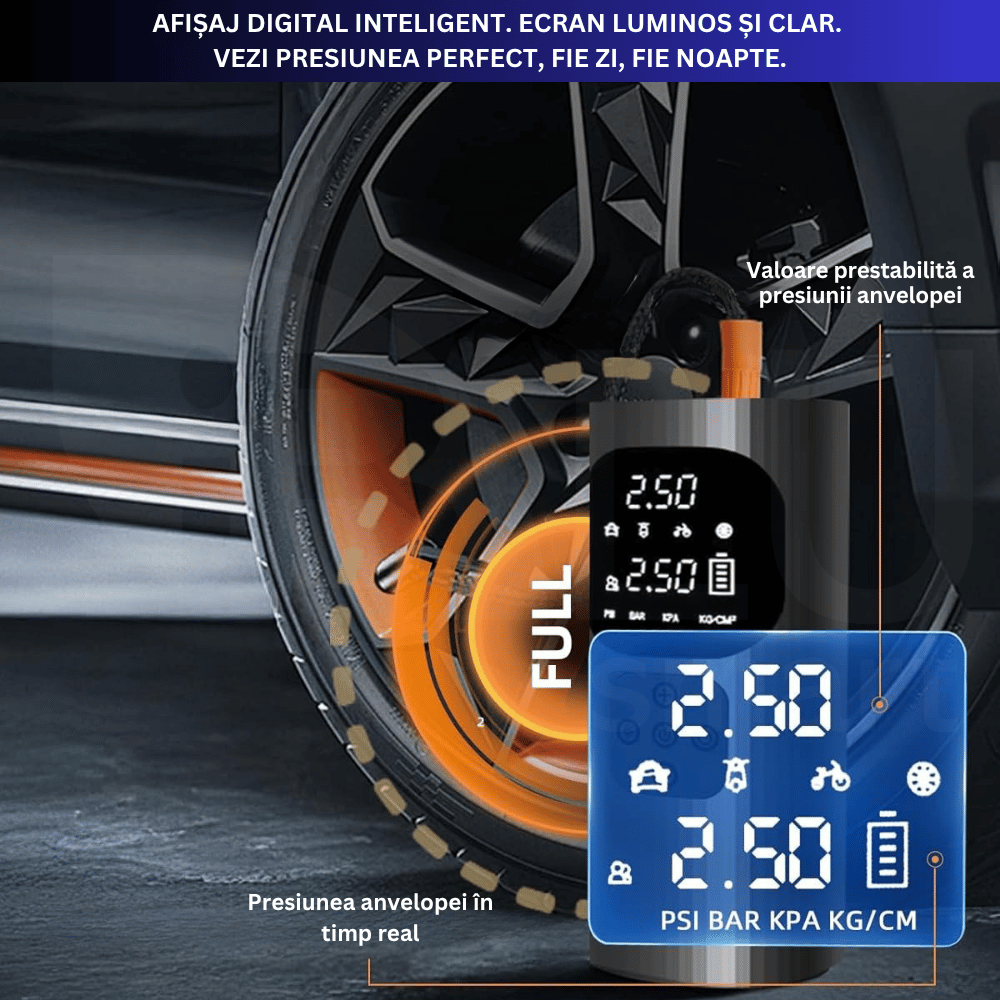 Setezi presiunea dorită pe display înainte de pornire, atașezi furtunul la valvă și pornești compresorul. Aparatul se oprește automat când presiunea atinge valoarea setată — nu trebuie să stai lângă el și să îl oprești manual. Eliminăm riscul de supraîncărcare a anvelopei.