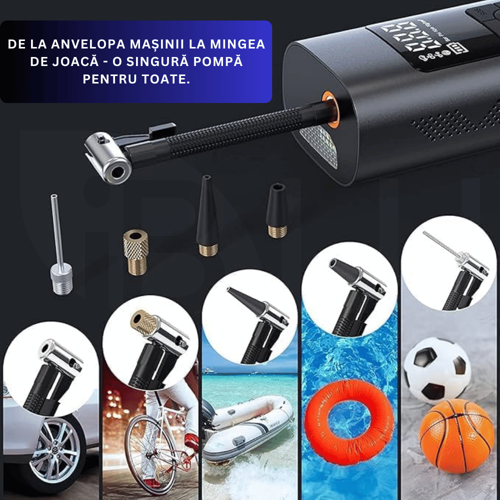 🔋 Oriunde ai fi, ești pregătit. iBLU 6-in-1 umflă rapid anvelope, mingi și biciclete – wireless sau la brichetă auto.