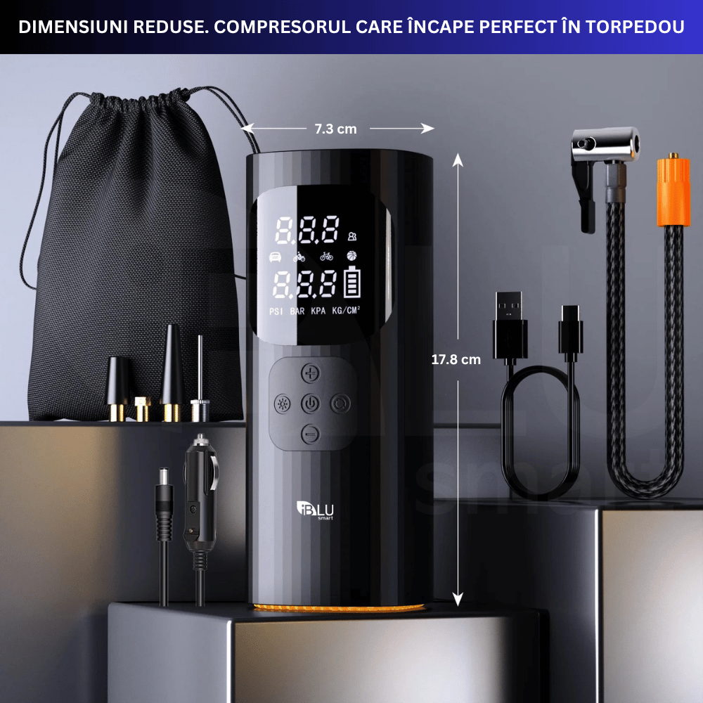 Descoperă compresorul auto 6-în-1 iBLU Smart – soluția portabilă perfectă pentru orice șofer. Cu un design compact, funcționare wireless sau direct de la bricheta auto, presiune de până la 150 PSI și umflare rapidă (25L/min), acest compresor este gândit pentru urgențe și întreținere zilnică. Include funcție Powerbank, lanternă LED cu 3 moduri, display LCD ușor de citit și presetări automate pentru auto, moto, biciclete și mingi. Totul într-un singur dispozitiv – cu husă de transport inclusă!