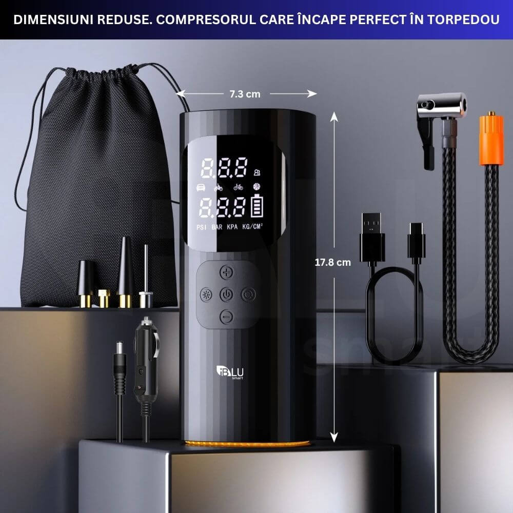 Cu o înălțime de doar 17.8 cm și un diametru de 7.3 cm, compresorul iBLU smart este proiectat pentru portabilitate. Încapă perfect în torpedou, rucsac sau husa de transport inclusă, asigurându-ți că ai mereu la îndemână puterea de care ai nevoie, fără a sacrifica spațiul prețios.